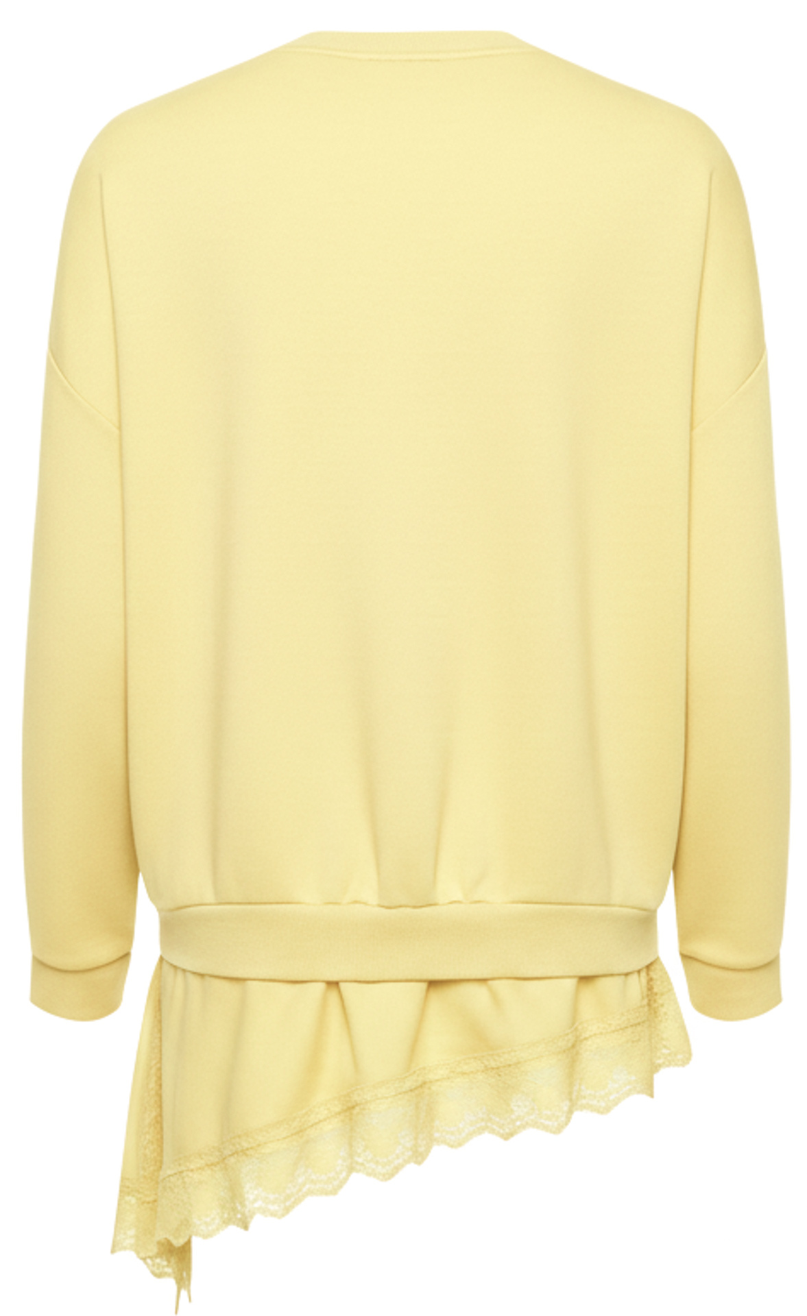 - Asymetryczna halka wszyta u dołu bluzy zakończona koronką delikatnie wystaje spod niej, tworząc efekt warstwowy i dodając stylizacji lekkości oraz elegancji.